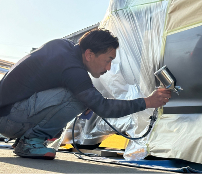 自動車の外装表面上の損傷を修復するリペアです。骨格フレームまで至らず交換対応が必要ない損傷に対応しています。トータルリペアFCの出張カーリペアは、環境と健康に配慮した水性補修塗料を使用しています。