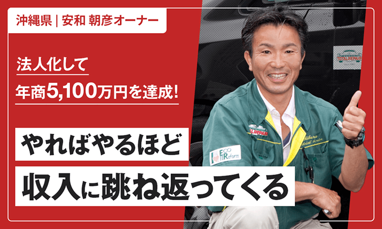 2013年に沖縄県で1人開業された安和オーナーは、経営が軌道に乗った後に法人化して従業員を雇い、2023年には年商5,100万円を達成されています。2015年に兵庫県で1人開業された村岡オーナーも、6年目に法人化されて、2023年には年商3,200万円達成。他にも同じように、個人事業主として独立して売り上げが上がってから法人化される事例があります。