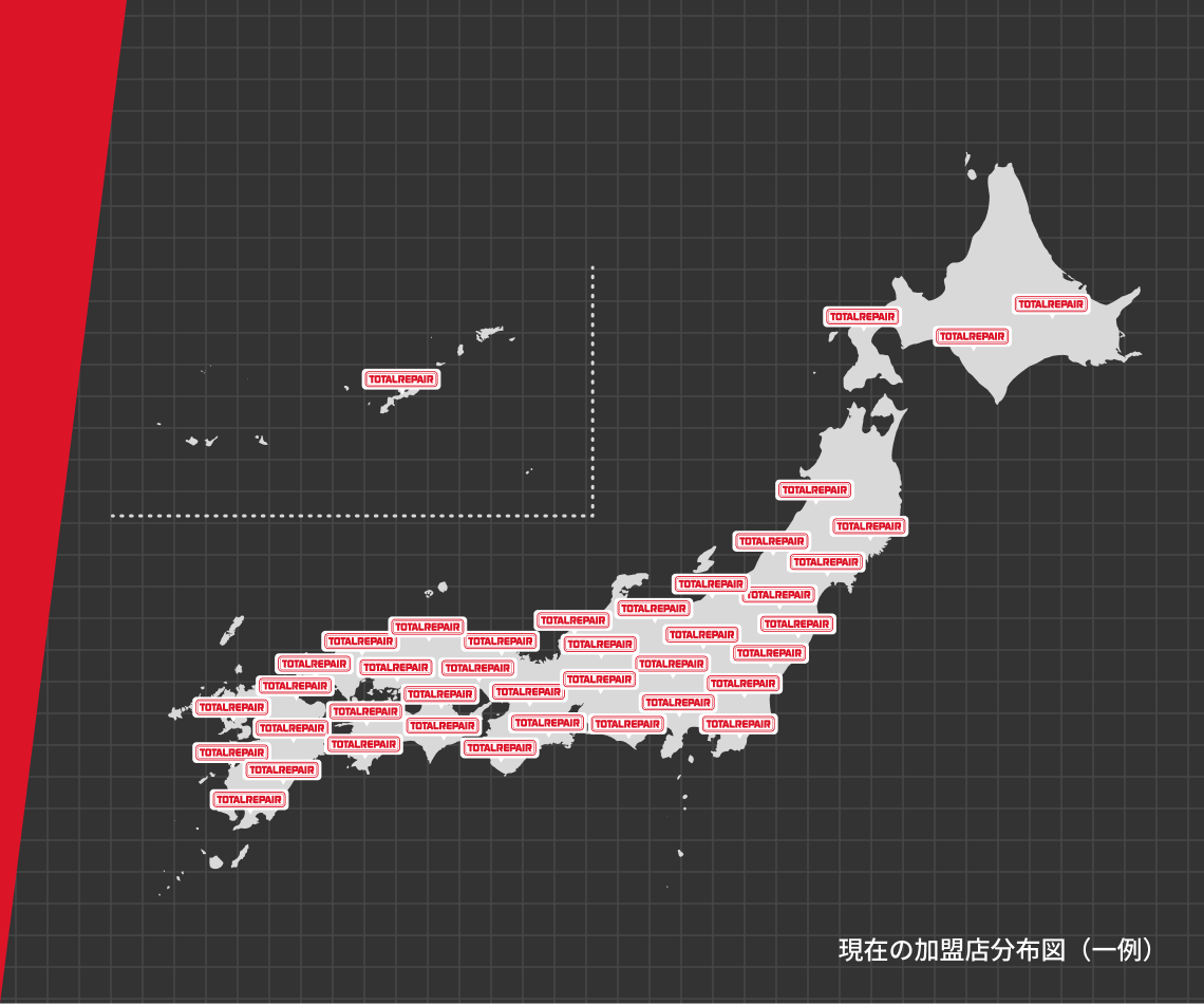 トータルリペアは、 自動車や住宅、 家具、 革製品など、 日々の生活で大切にされている様々なモノの傷・劣化を補修するリペアサービスを提供しております。全国に1,000店以上展開する大型フランチャイズチェーンです。