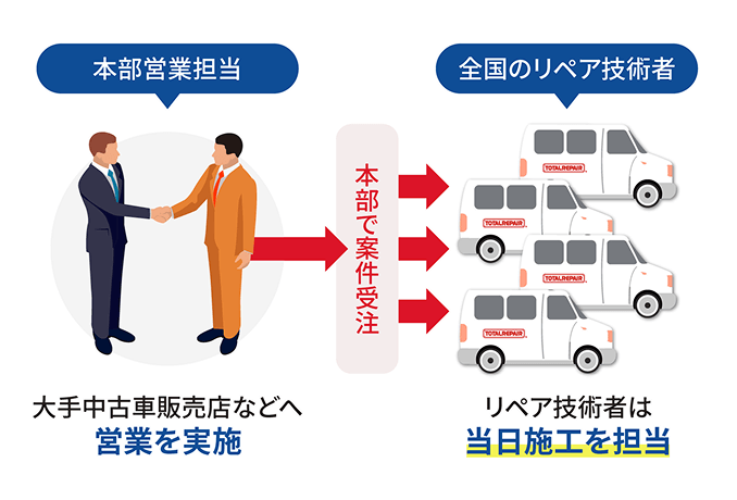 トータルリペアFCでは、加盟店様に営業の負担をかけないよう、本部が案件紹介部門を強化しています。これにより、他社にはない安心感を提供し、仕事が途切れるリスクを軽減するサポート体制が整っています。独立後も加盟店様が安定したビジネスを運営できるよう、全力でバックアップいたします。