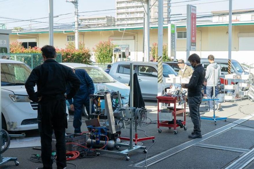 技術講習では、小破を対象とした屋外施工での板金塗装に特化したノウハウを習得します。まずは実車パーツを使って、板金塗装の基礎や、屋外施工に最適化された水性補修塗料や機材の扱い方を学習。さらに、実際の施工環境に近い屋外での講習を通じて、対応力と技術レベルを高めていきます。