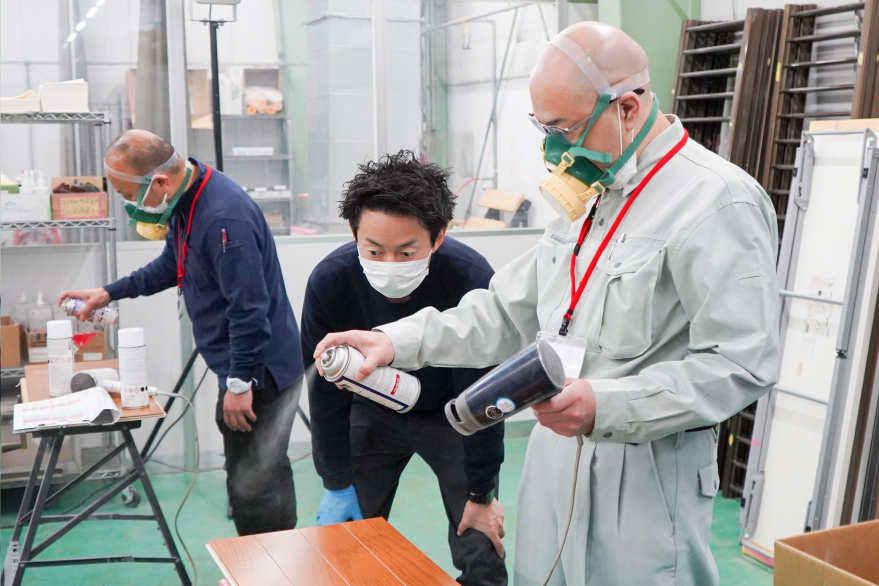 開業前の技術講習は、ほとんどの方が全くの未経験からスタートし、仕事を受けられるレベルの技術力を身につけて修了しています。木部やサッシなど、幅広い素材や傷の状態に合わせてたリペア方法を基礎から学習。さらに、現場を想定した実践訓練を通じて、仕上がりの判断基準やトラブル対応力も身につきます。