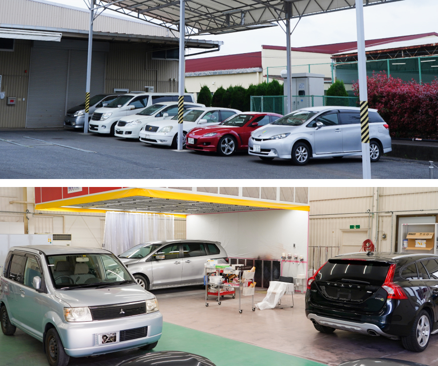 講習で段階的に技術を習得できるよう、トータルリペアFCでは屋内と屋外、2つの研修設備を用意しています。研修初期は、安定した環境で基礎をしっかり身につけられるよう、屋内の設備で講習を実施。後半は、天候や温度、湿度、光の影響を受ける実際の現場を想定し、屋外の設備で実践的な講習を行います。
