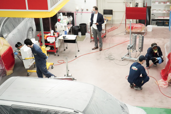 専用の研修施設にて、ボンネットやドアパネル等のパーツを使いながら、下地や塗装の基礎を学びます。未経験からでも技術習得して現場で活躍できるよう、インストラクターが寄り添いアドバイス致しますので、ご安心ください。