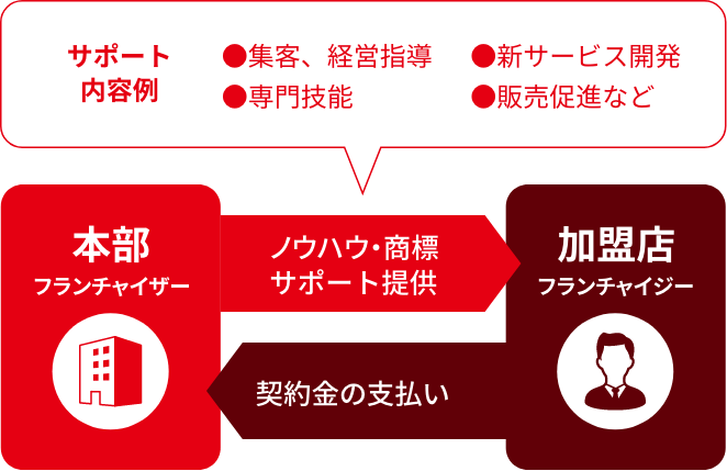 本部(フランチャイザー)が加盟店(フランチャイジー)に対して、ビジネスノウハウや各種サポートを提供。それに対してフランチャイジー(加盟店)が一定の契約料を支払います。