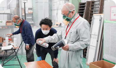 住宅や家具の木部の補修を行うリペアです。フローリングや柱、ドアなど、住宅の様々な箇所に使われる木材の傷や欠損、凹みを修復・復元します。その他にも、アルミや樹脂などのサッシ補修技術も含まれます。