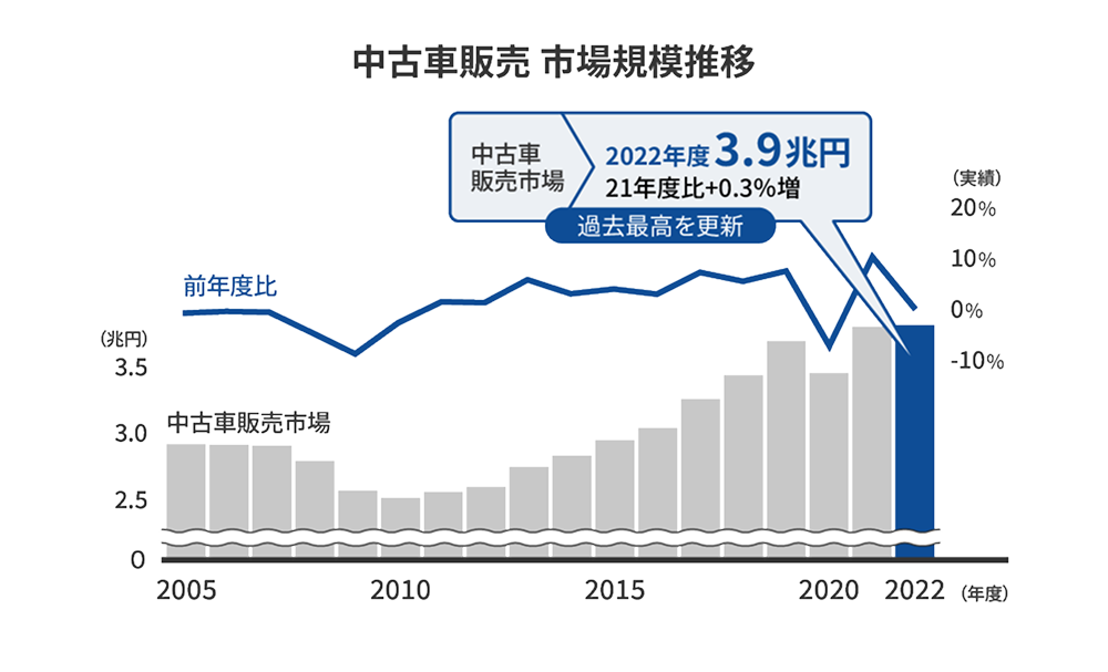 半導体不足の影響による新車の供給量減や納車遅れなどによって中古車の需要が高まり、中古車販売市場の市場規模は2022年度に過去最高の3.9兆円を更新。