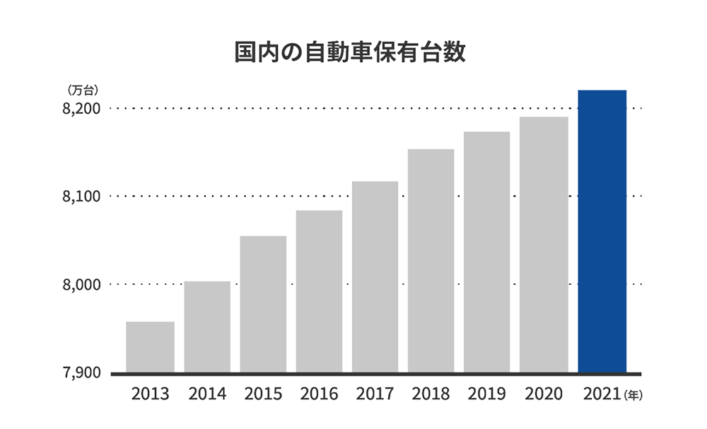 国内の自動車保有台数は右肩上がりに伸びており、2021年には8,200万台を超えました。この車の全てがリペアの対象となります。