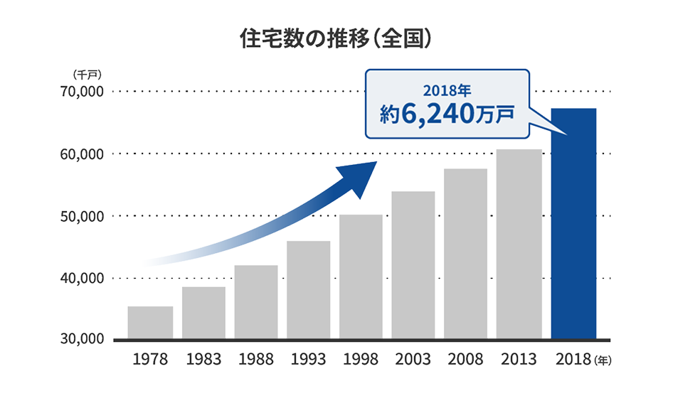 日本における総住宅数は、2018年 10月時点で、なんと約6240万7千戸。新築・中古住宅関わらず、これらの物件、全てが住宅リペアの施工対象です。さらに、グラフを見て分かるように、年々その戸数は増えています。