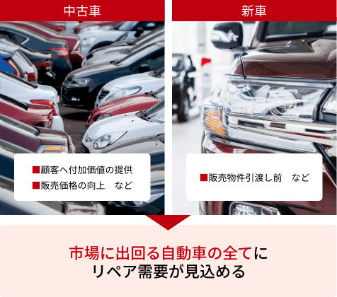 内装の美しさは、中古車の場合、販売価格に直結する重要な事項のため、予め補修のスケジュール・予算が組まれている場合が多く、中古車の数だけリペアの需要が見込まれます。