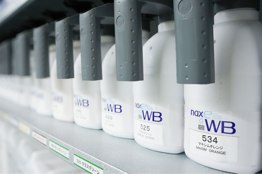板金塗装工場では一般的に有機溶剤を使用しますが、トータルリペアFCでは主に水性補修塗料を使用します。