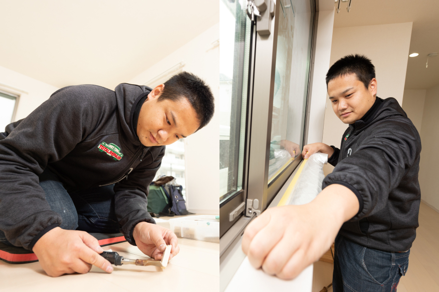 さらに、一般的には住宅内の施工場所に応じて、リペアの依頼先が異なります。例えば、フローリング・家具の場合は施工した工事業者や家具メーカー。サッシの場合は、取付業者やサッシメーカーなどです。発注時の手間に加え、リペア専門業者では無いため、担当作業員によって品質・作業時間のバラツキも懸念されます。そのためこの業界では、広い作業範囲への対応力と、品質・時間にブレがない技術力を持ったリペア専門職人が求められています。
